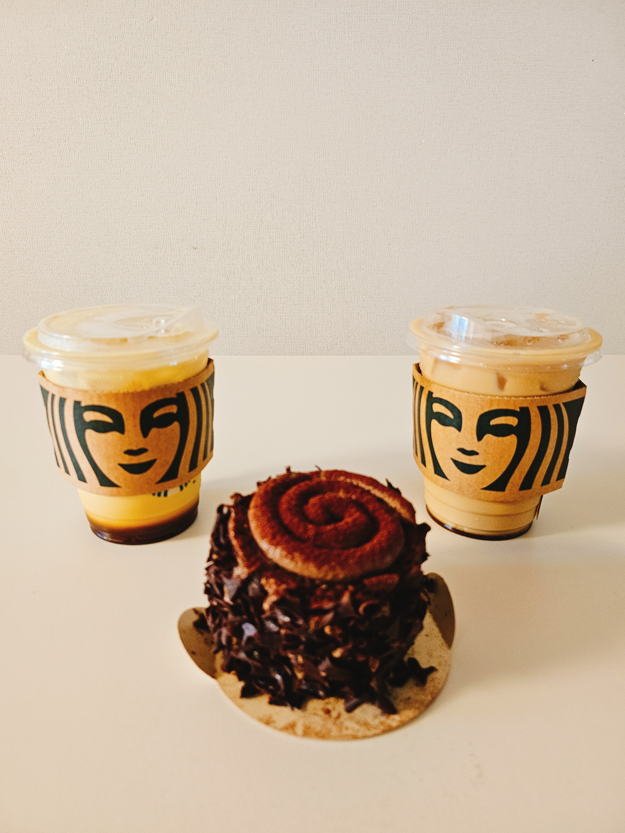 프렌치 바닐라라떼와 바닐라 크림 콜드브루와 촉촉 초콜릿 생크림 케이크 세트입니다