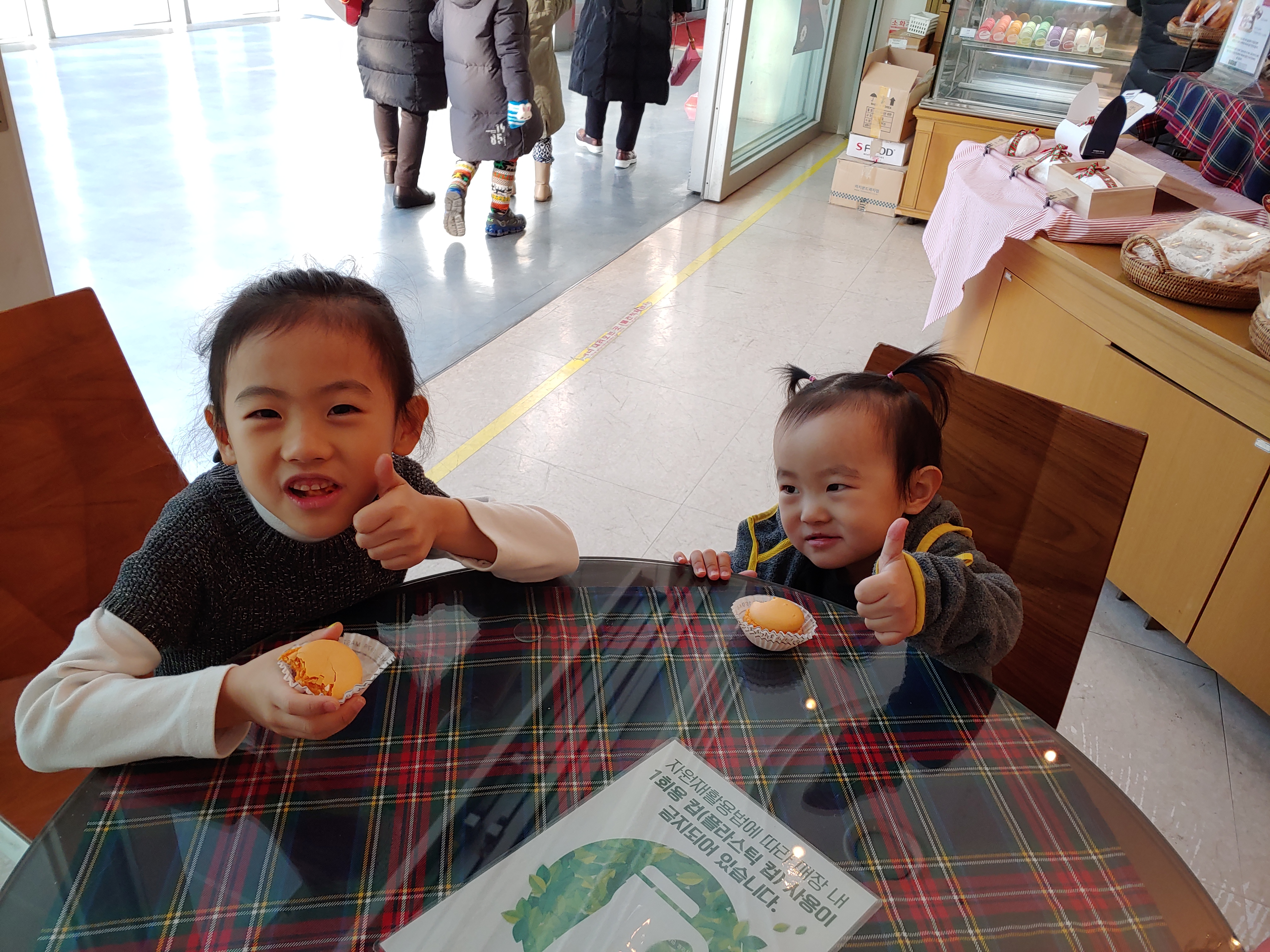 공주들이 좋아하는 마카롱을 먹고는 최고 손가락을 들어 보입니다.