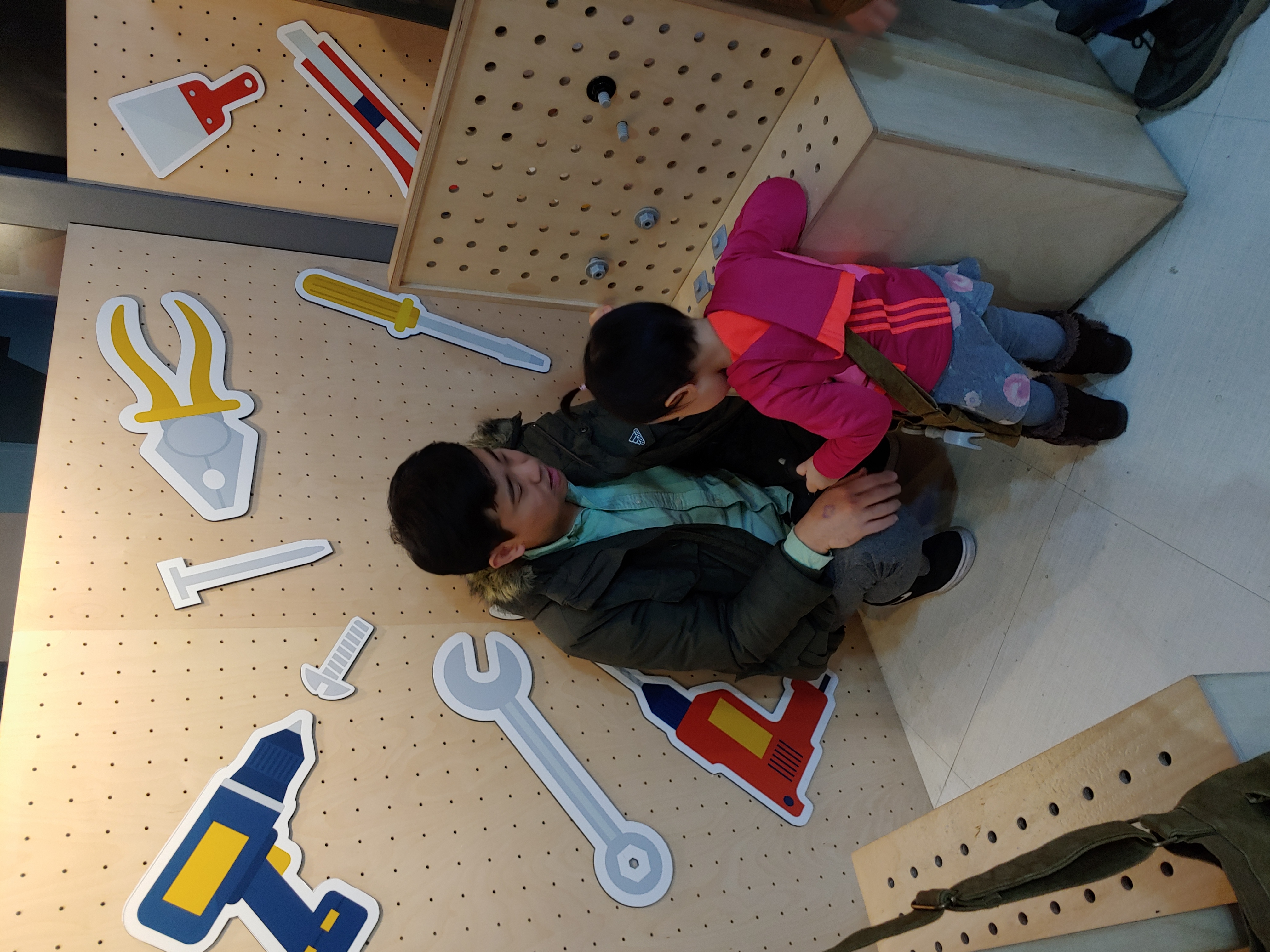 아빠와 함께 나사를 열심히 조이고 여러 가지 공구를 사용해보고 있군요.