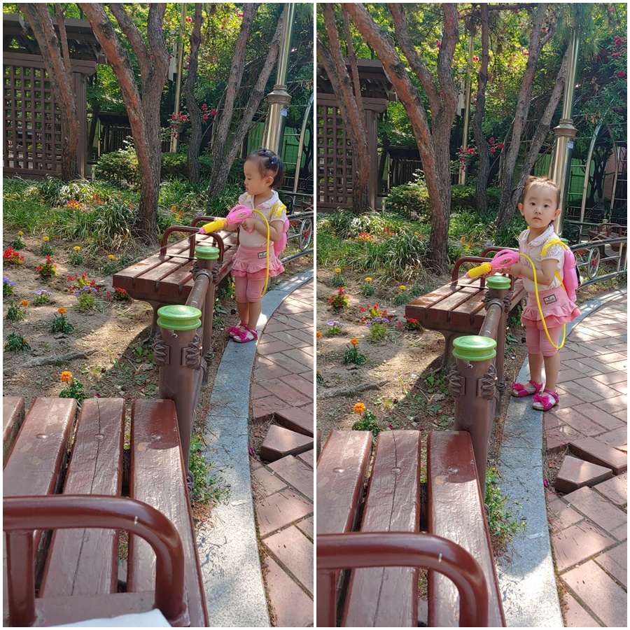 엄마가 미리 준비해 간 물총으로 예쁜 꽃에 물을 주고 있군요.