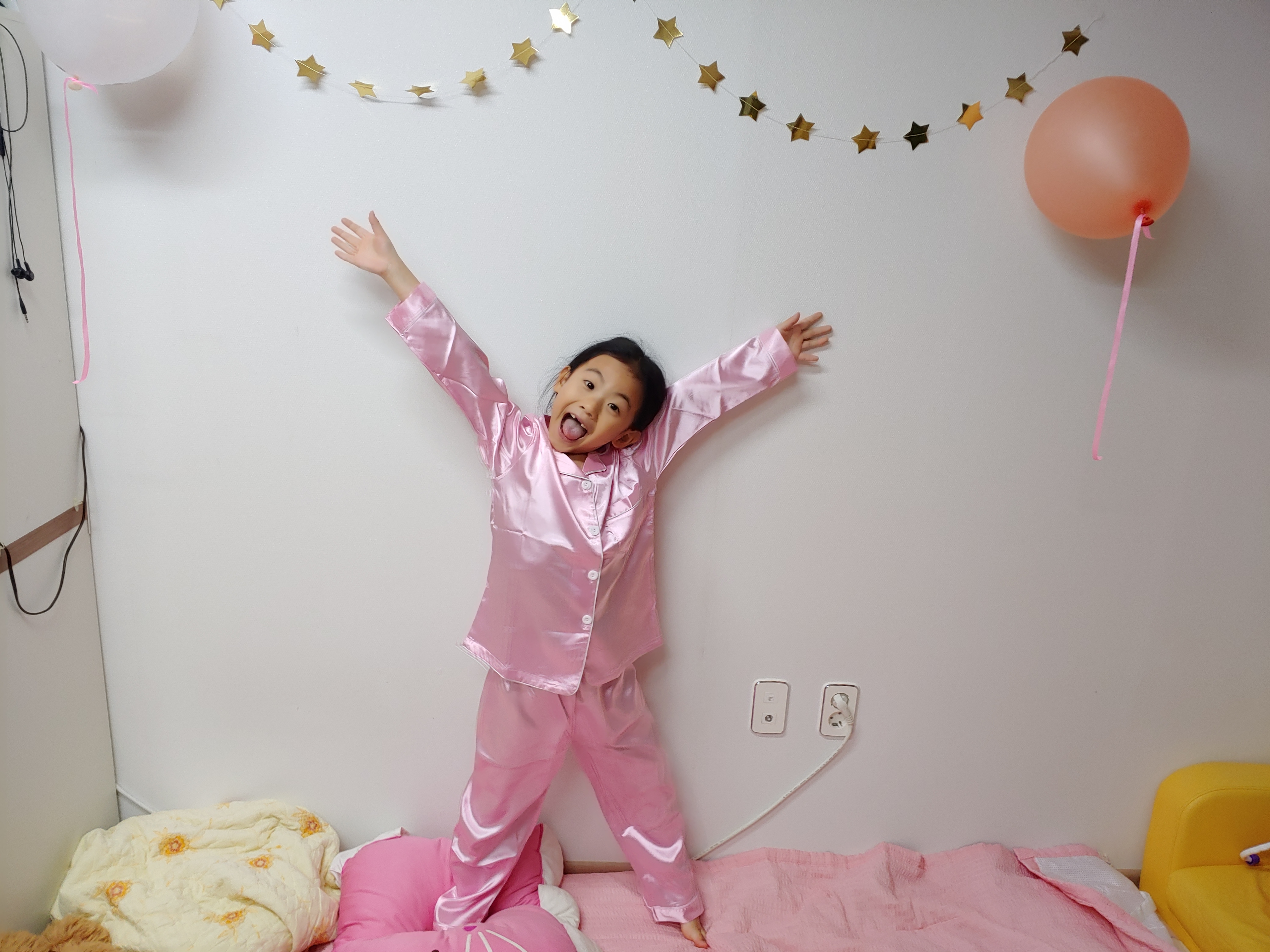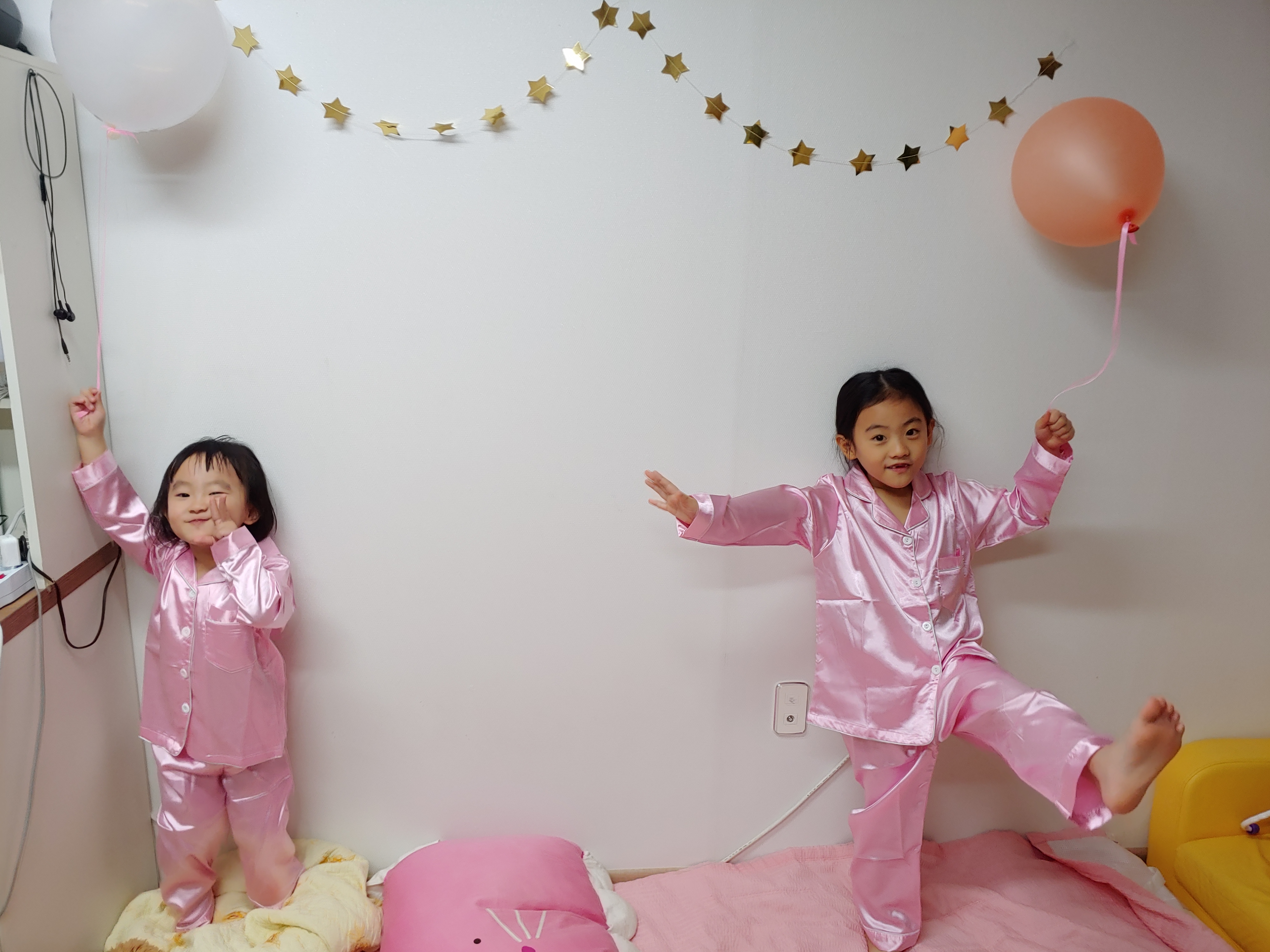 세트로 맞춰 입은 핑크잠옷이 마음에 쏘~옥 들었는지 즐거워하는 표정입니다.