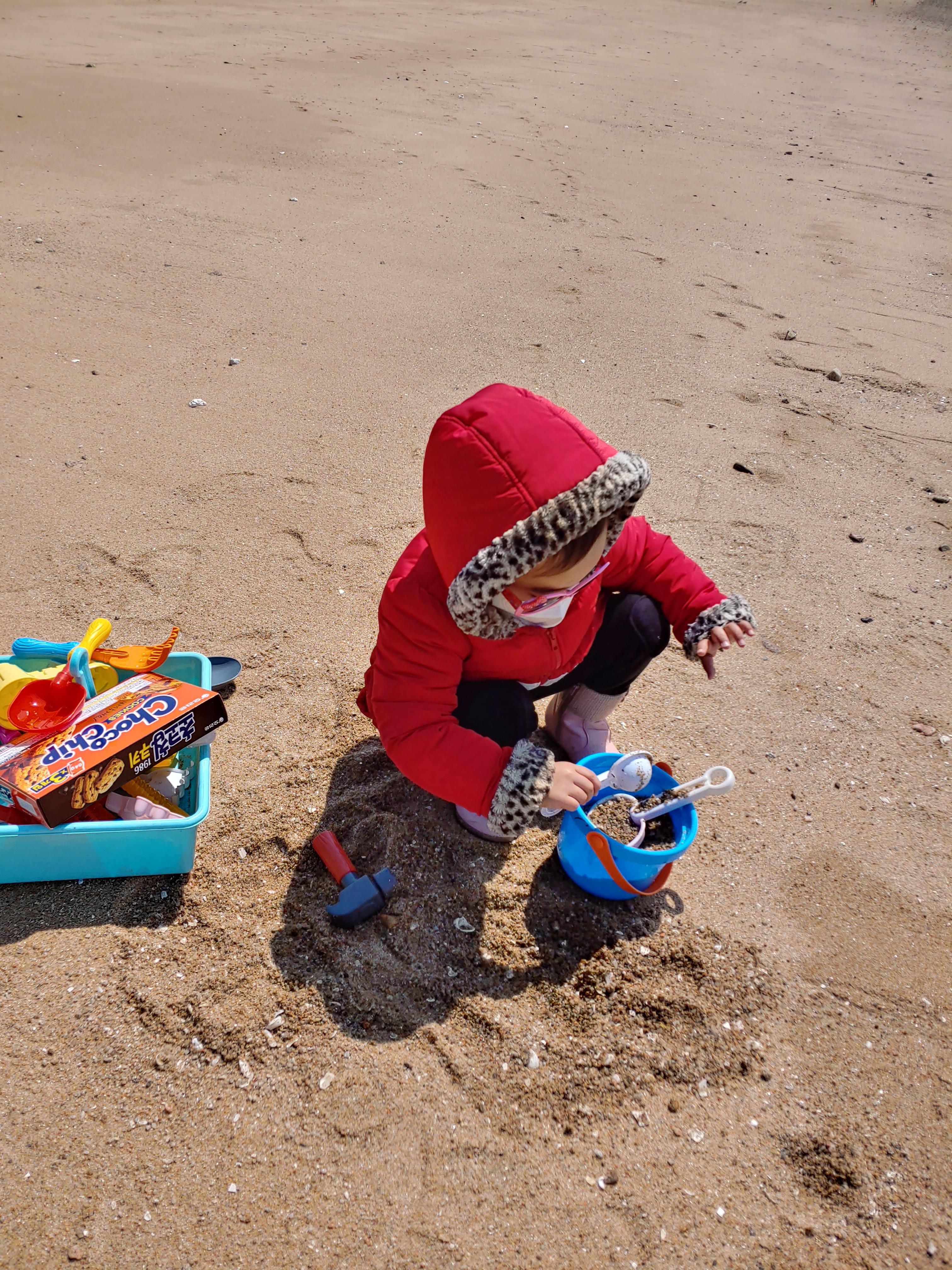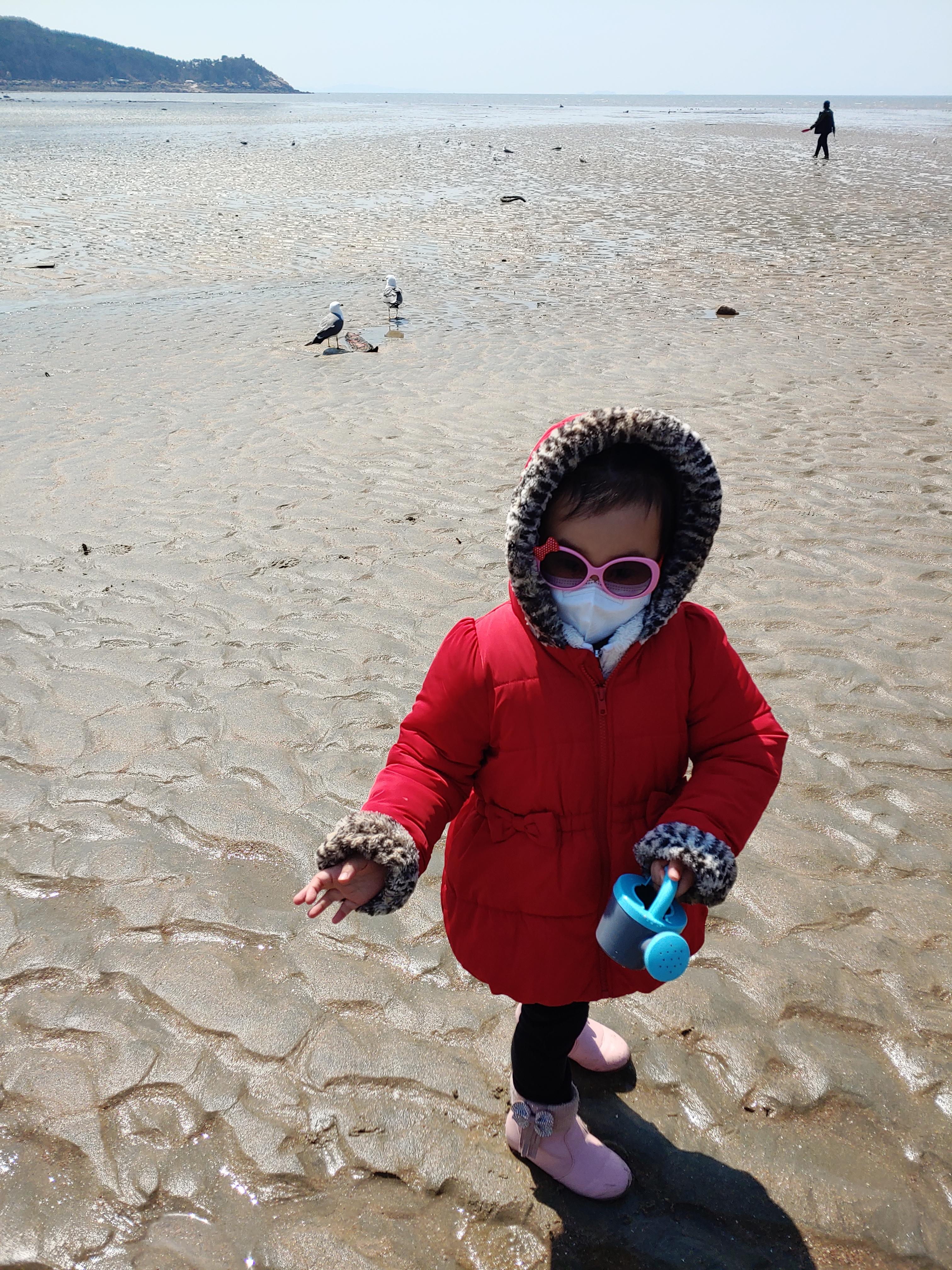 모래놀이에 옷에 물에 젖었지만 겨울 점퍼를 입혀 놓았기에 안심입니다.