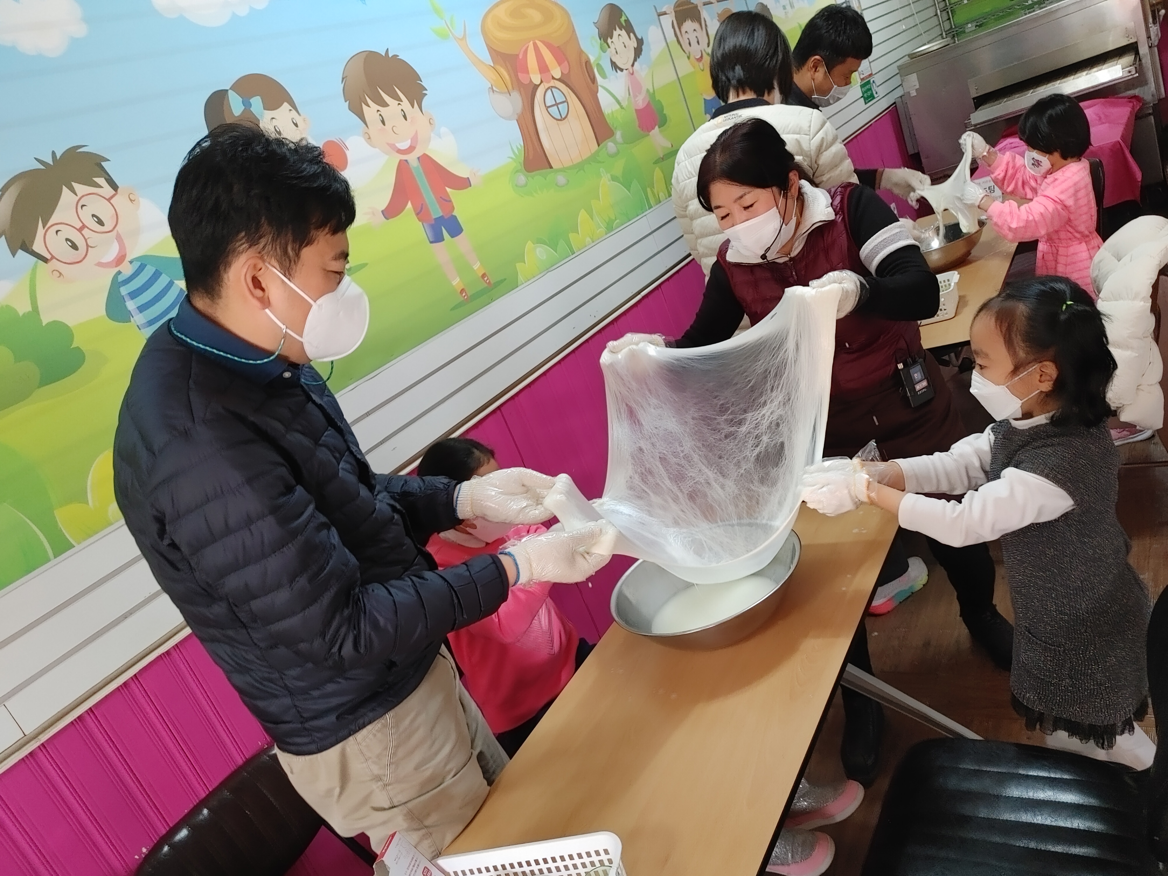 장갑을 끼고 치즈를 만들기 시작하였습니다~