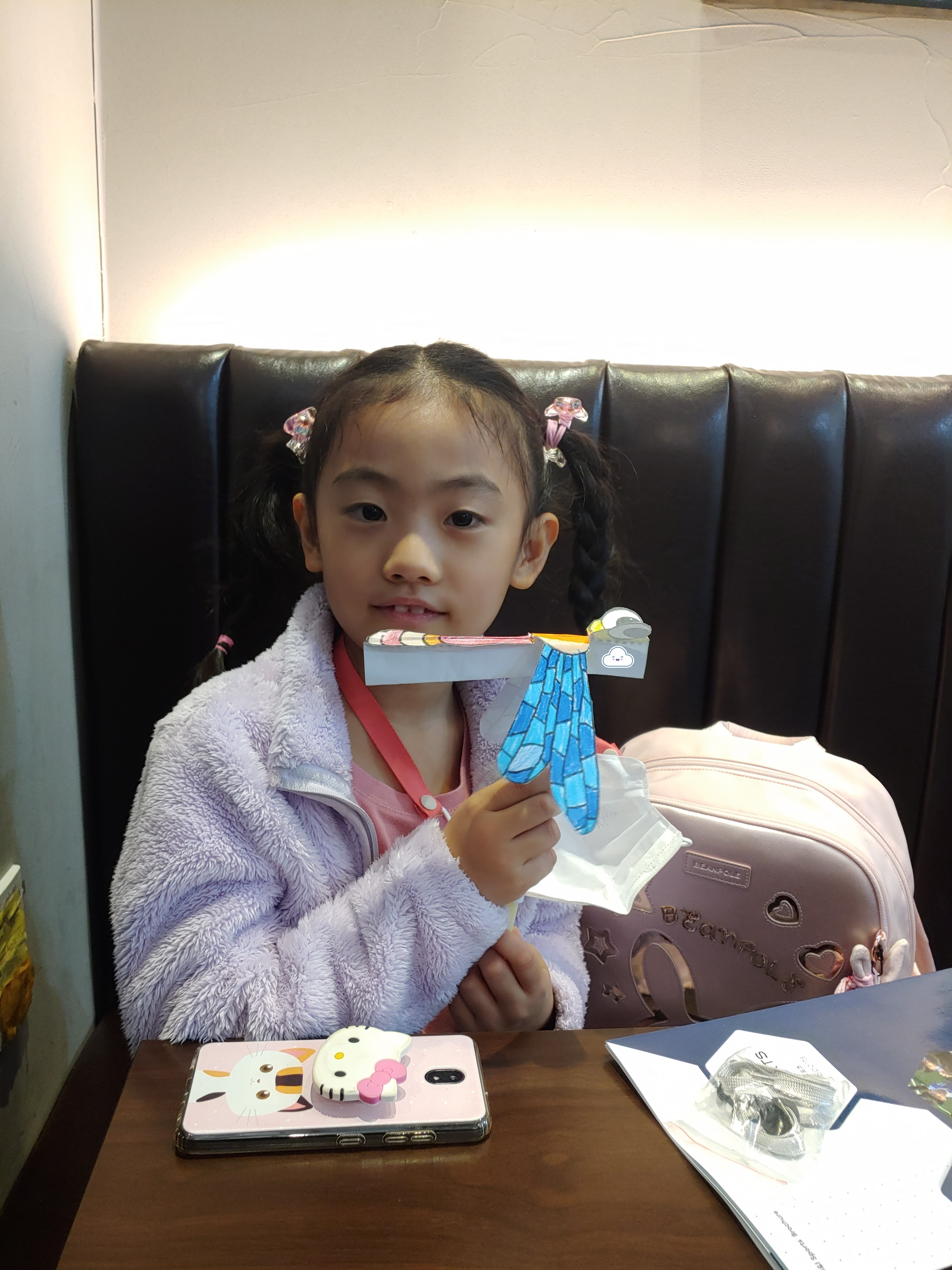 학교에서 만들기 한 작품을 엄마에게 보여주는 중입니다.