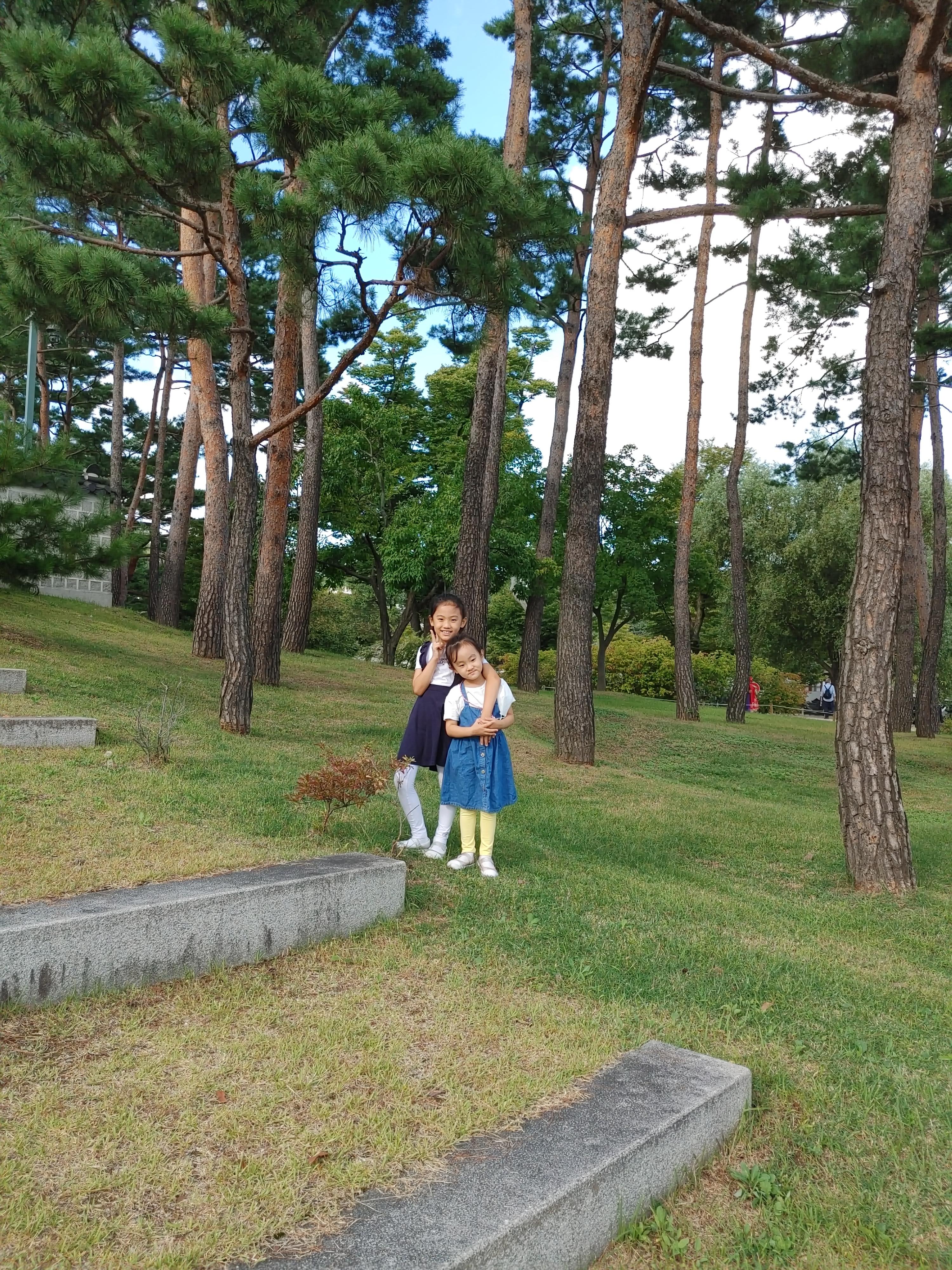 푸른 잔디 위의 곧게 뻗은 소나무 사이에서 보내는 시간은