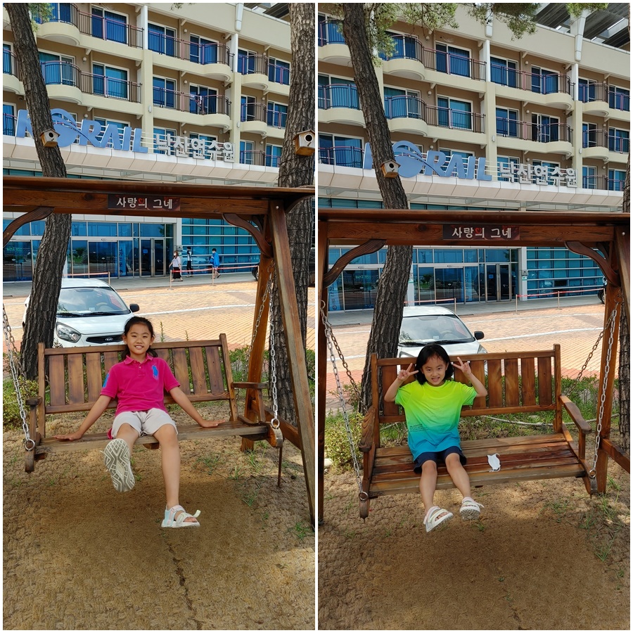 코레일 낙산연수원에 도착하여 바다를 보며 그네를 타 보았습니다.
